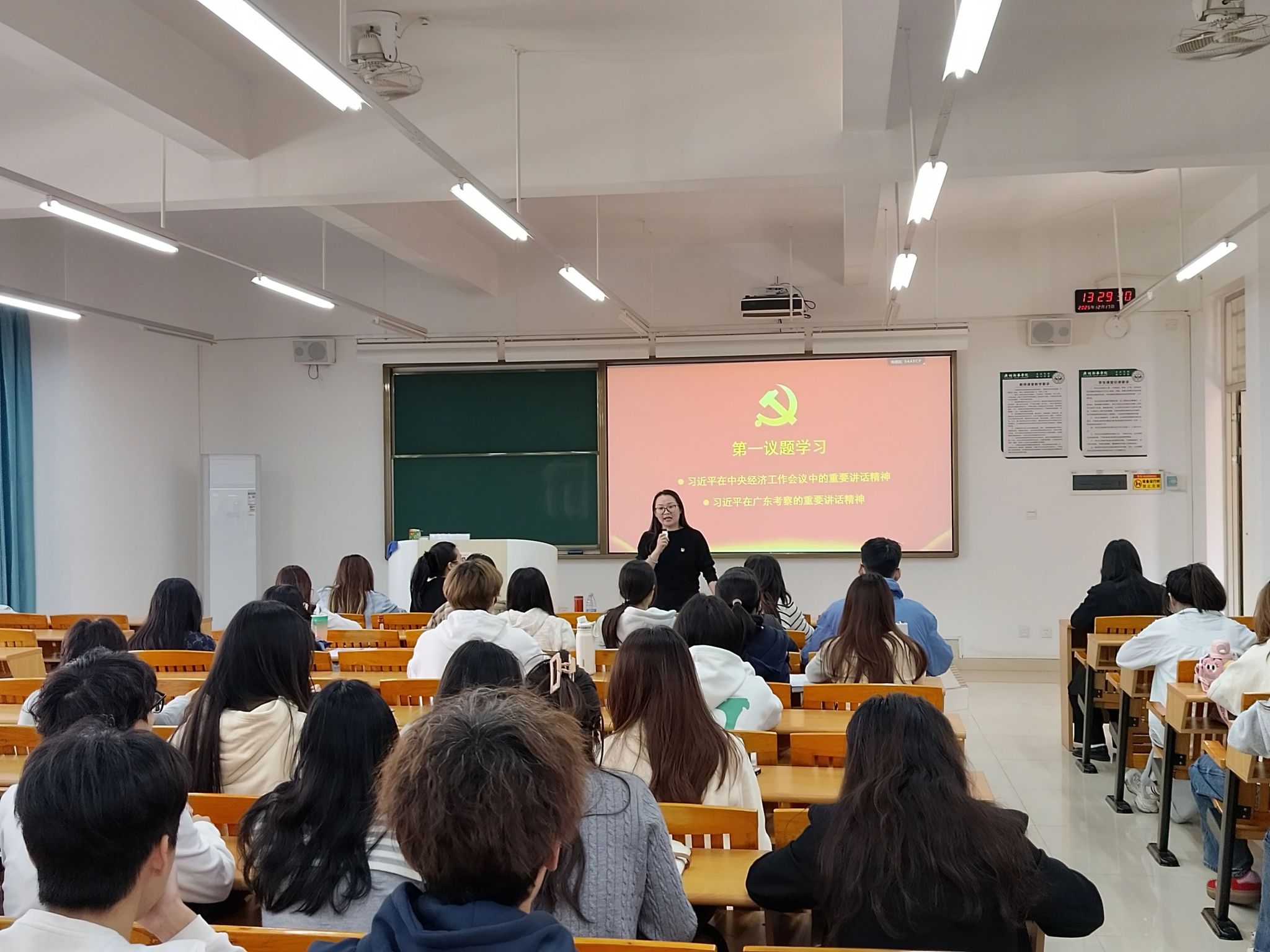 2025年12月17日,国际学院师生联合党支部举行党的二十届四中全会精神宣讲会,专题学习习近平总书记重要讲话精神,并系统解读"十五五"规划建议要点。支部书记李文蓓主持宣讲会,全体师生党员、发展对象及入党积极分子参加学习。