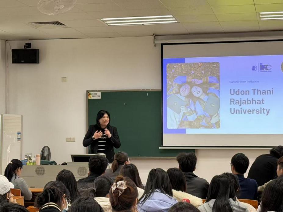 讲座中,萨维特里博士首先介绍了乌隆他尼皇家大学的发展历程:学校1923年以师范教育为起点,2004年正式升格为大学,多年来扎根泰国东北部,始终以教育创新与社区发展为核心方向,在服务本地需求的同时持续推进国际接轨。