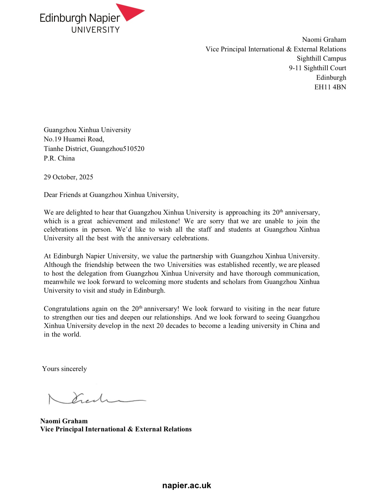 时光轻吟,奏响 20 年的华彩乐章;岁月流转,绘就20年的绚丽画卷。广州新华学院在 20 年的风雨兼程中,以开放包容的姿态拥抱世界,在国际教育的舞台上留下了坚实而深刻的足迹。值此 20 周年校庆之际,宛如一场跨越国界的温暖相聚,国外合作高校带着满满的诚意与祝福,跨越千山万水,为这所充满活力与梦想的学府送来最美好的祝愿,共同谱写一曲国际教育交流与合作的动人赞歌。