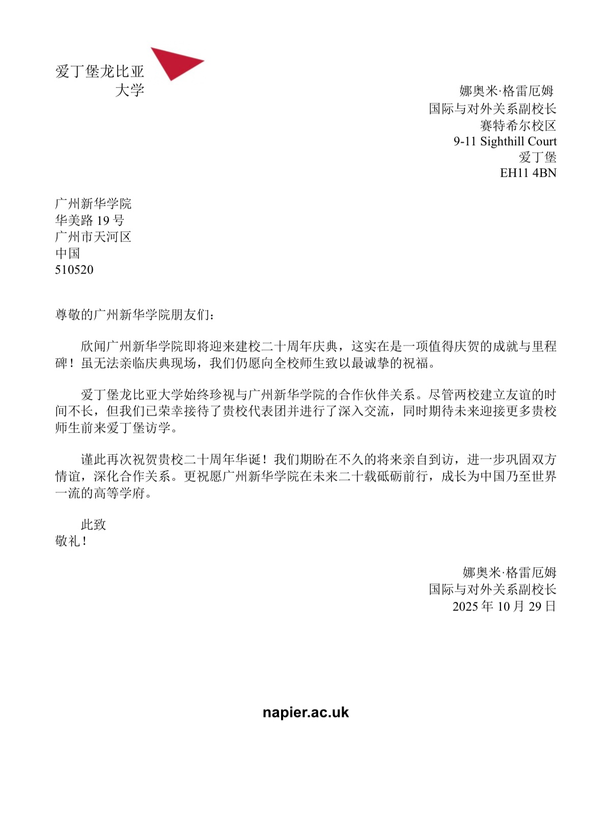 在发来祝福的院校中,英国伯明翰纽曼大学、法国国立路桥大学商学院通过视频表达了诚挚祝贺,英国爱丁堡龙比亚大学则寄来正式贺函,多方诚挚致意,跨越山海,同贺新华二十载育人辉煌,共期未来深度合作新篇。