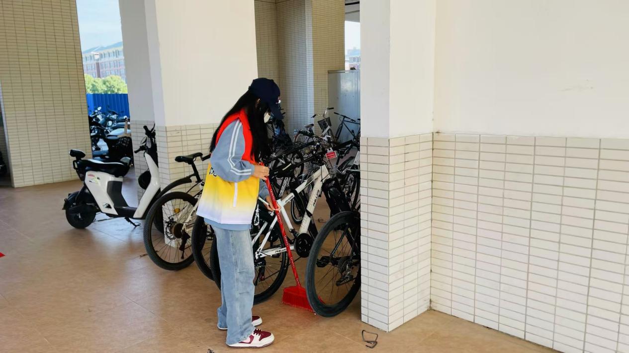 秩序小组针对教学区、宿舍区周边非机动车乱停乱放的问题展开整治。志愿者们将占道的单车逐一搬移、摆放整齐,重新规划车辆停放区域,有效解决了车辆占道导致的通行困扰,让校园车区秩序井然。