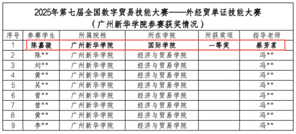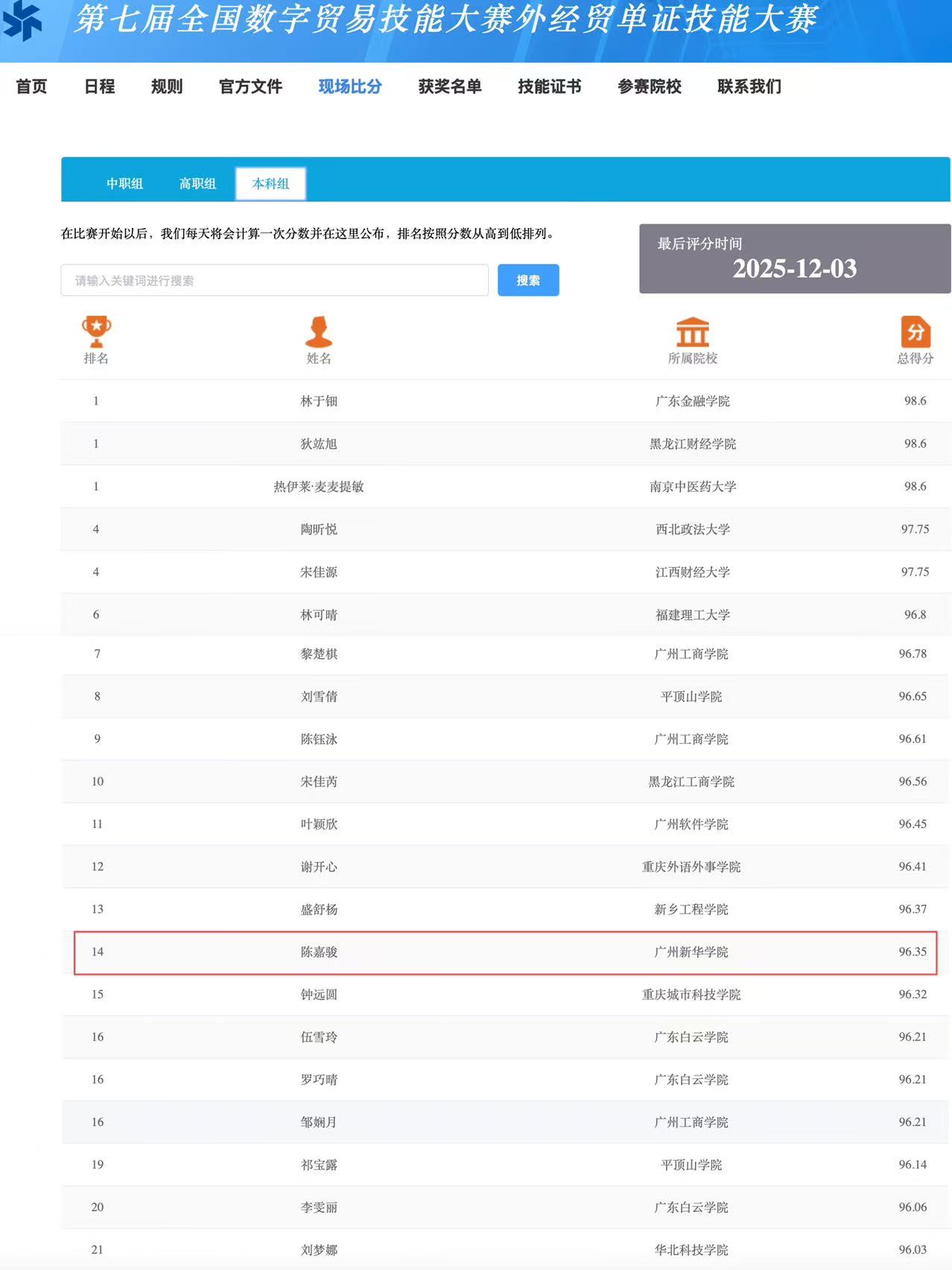2025年12月3日,第七届全国数字贸易技能大赛(外经贸单证赛项)获奖名单揭晓。由国际学院工商管理教研室主任蔡芳茗老师指导的 2023 级工商管理(创新班)B 班陈嘉骏同学以96.35的高分荣获全国本科组一等奖,实现了我院在该项赛事上的历史性突破。